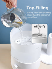 Top-Fill Humidifier: Remove the lid to add purified water directly into the water tank. The 6.7in (17cm) wide opening allows easier filling and cleaning. Tips: Recommend to clean the tank once a week for better user experience.