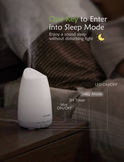 Considerate Sleep Mode♥ Press the “SLEEP” mode button, then oil diffuser for essential oils will turn to “sleep” with light off and low mist output(10-22ml/h) to avoid any disturbing. Under the sleep mode, the low mist output lasts for 6-12hrs, saving you the trouble of refilling water at nights. (The indicator will turn to blue and shut off after 10s when there is no other operation.