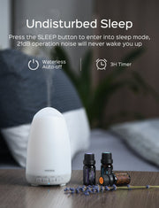 Victsing oil diffuser operates at a near-silent 21dB, so you won’t be disturbed while sleeping, studying, or working. Press the SLEEP button to enter into sleep mode with LED lights turned off, and add few drops of lavender oil for a sound sleep. 3H timer, waterless auto-off and BPA-free material brings ultimate convenience and reliability.