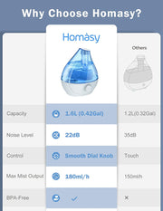 1.6L Cool Mist Humidifier. 22dB Whisper-Quiet For Bedroom. Auto Shut-Off.
