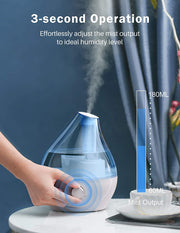 The stylish water-drop humidifier can produce more and thinner mist. The tilted nozzle is specially designed to provide a wider humidifying coverage.