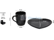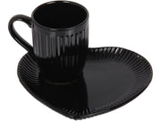 Coffee Cup & Snack Plate Set. Lined Cups. Heart Shaped Plate. Stoneware. (Black)