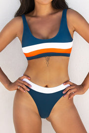 Our Blue White and Orange Sporty Bikini will be your favorite suit to wear whether you're sunbathing or surfing! This bikini top features a sporty tank design with stripe detailing. Matching bottom features a contrast trim waistband with high cut leg with cheeky coverage.