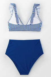 Walk on the sandy beaches in our Blue Striped And High Waisted Bikini. This blue and white stripe bikini top has a v-neck with ruffles to accentuate the chest and bust. The matching blue bikini bottom with white piping is high waisted to provide flattering tummy coverage.