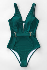 Made to impress! This Stunning Green One Piece Swimsuit is a show stopper. Features a deep v-neck silhouette that adds a flirty touch. Includes a belt for that hourglass effect. Padded cups provides light support.