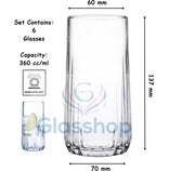 Highball Glass Set. Cocktail / Juice / Water Glasses. (Pack of 6) (360 cc/ml)