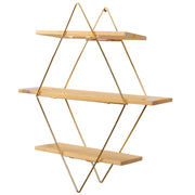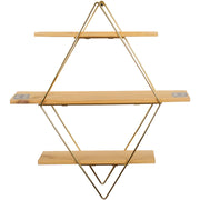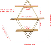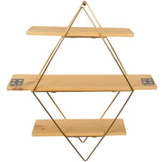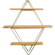 Decorative Mounted Wall Shelf. 3 Tier Prism Unit Rack. (Gold Metal & Solid Wood)