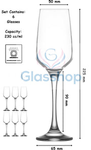 Champagne Flutes. Long Steam Prosecco Sparkling Glasses. (Set of 6) (230 cc/ml)