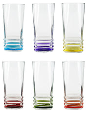 Enhance your drink presentation with this set of highball glasses featuring colored bases. The vibrant hues include blue, purple, yellow, red, green, and orange, adding a playful touch to your beverage experience.
