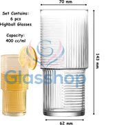 Glasshop Highball Cocktail Glasses. 6-Pack, 400ml Stackable Striped Glass Set.