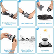 Powerful Cyclonic Suction: The turbine motor provides a stable UP TO 8 KPA strong cyclonic suction for the hand vacuum to absorb garbage like pet hairs, crumbs, etc. A smart choice for both car& home cleaning.